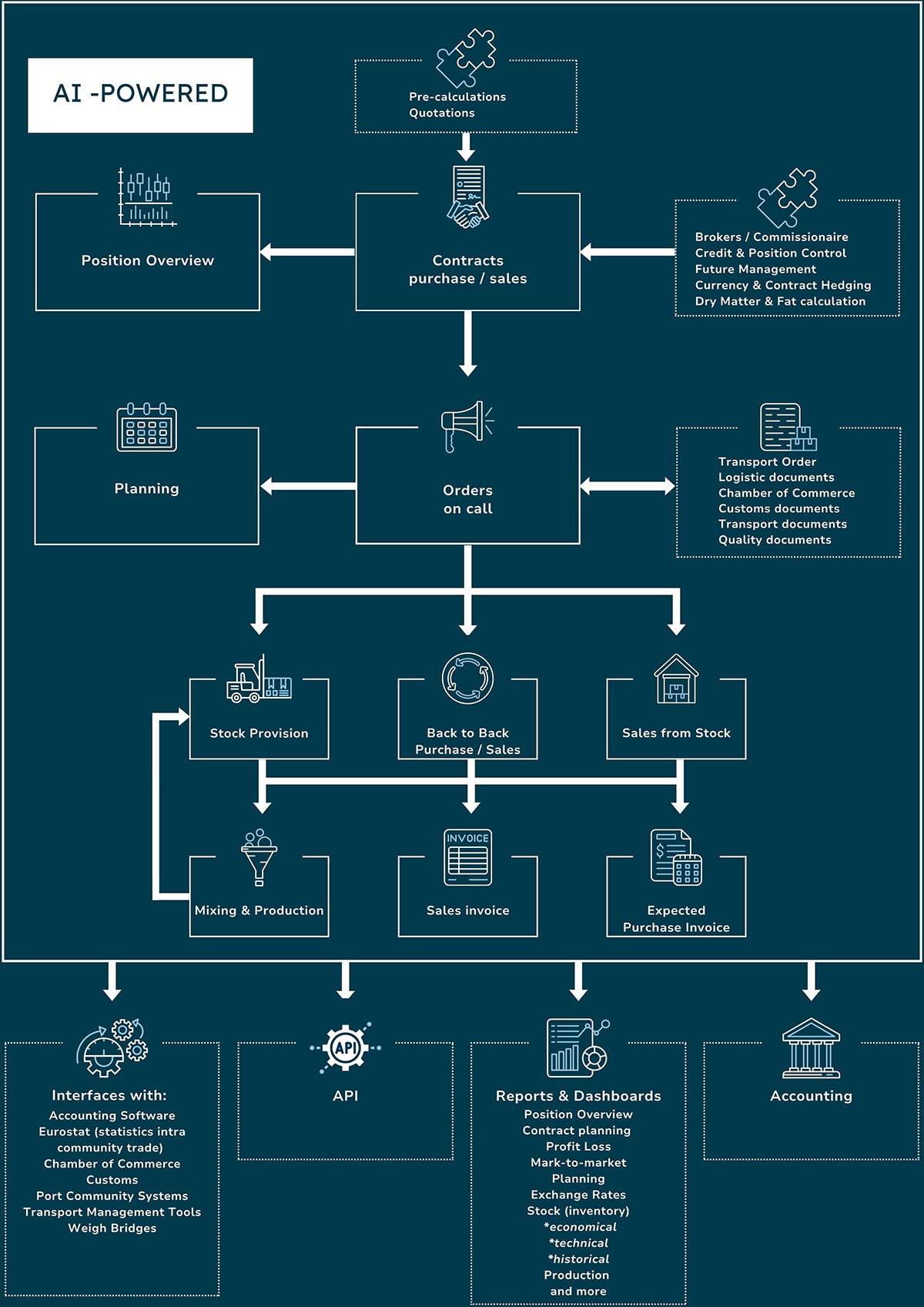 Moo Software is designed for companies trading dairy ingredients, plant-based ingredients, and other specialized raw materials. Its sector-focused workflows make the system a central hub for organizations that want to streamline trading, optimize logistics, and maintain full control over every movement of goods.
